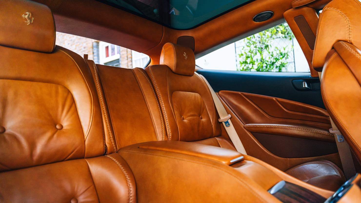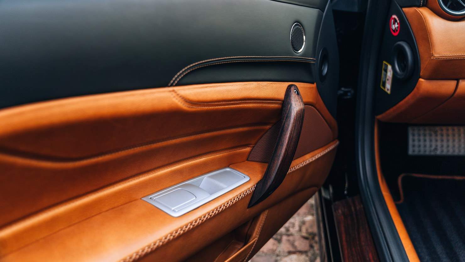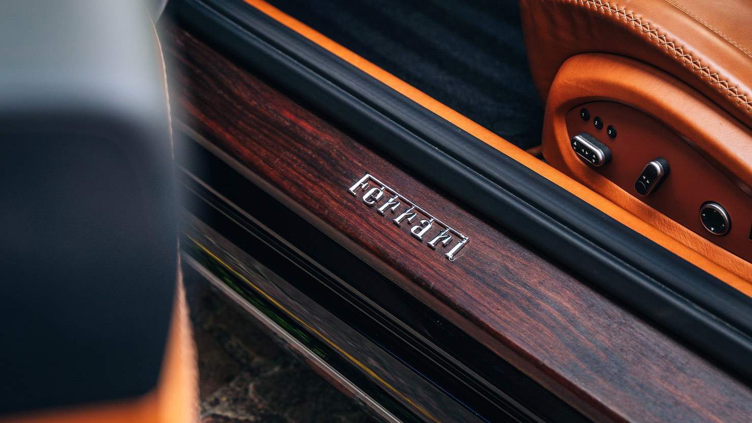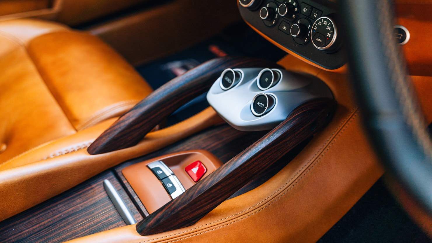 This particular car was built as a demonstration of Ferrari’s bespoke design programme and is highly specified throughout with options not available on the standard options list. This includes the 4-layer Piano Black paintwork with Grigio painted pinstriping, as well as seats inspired by the Dezza Poltrona Frau chair complimented by wood trim throughout the cabin and boot.