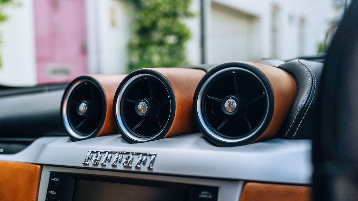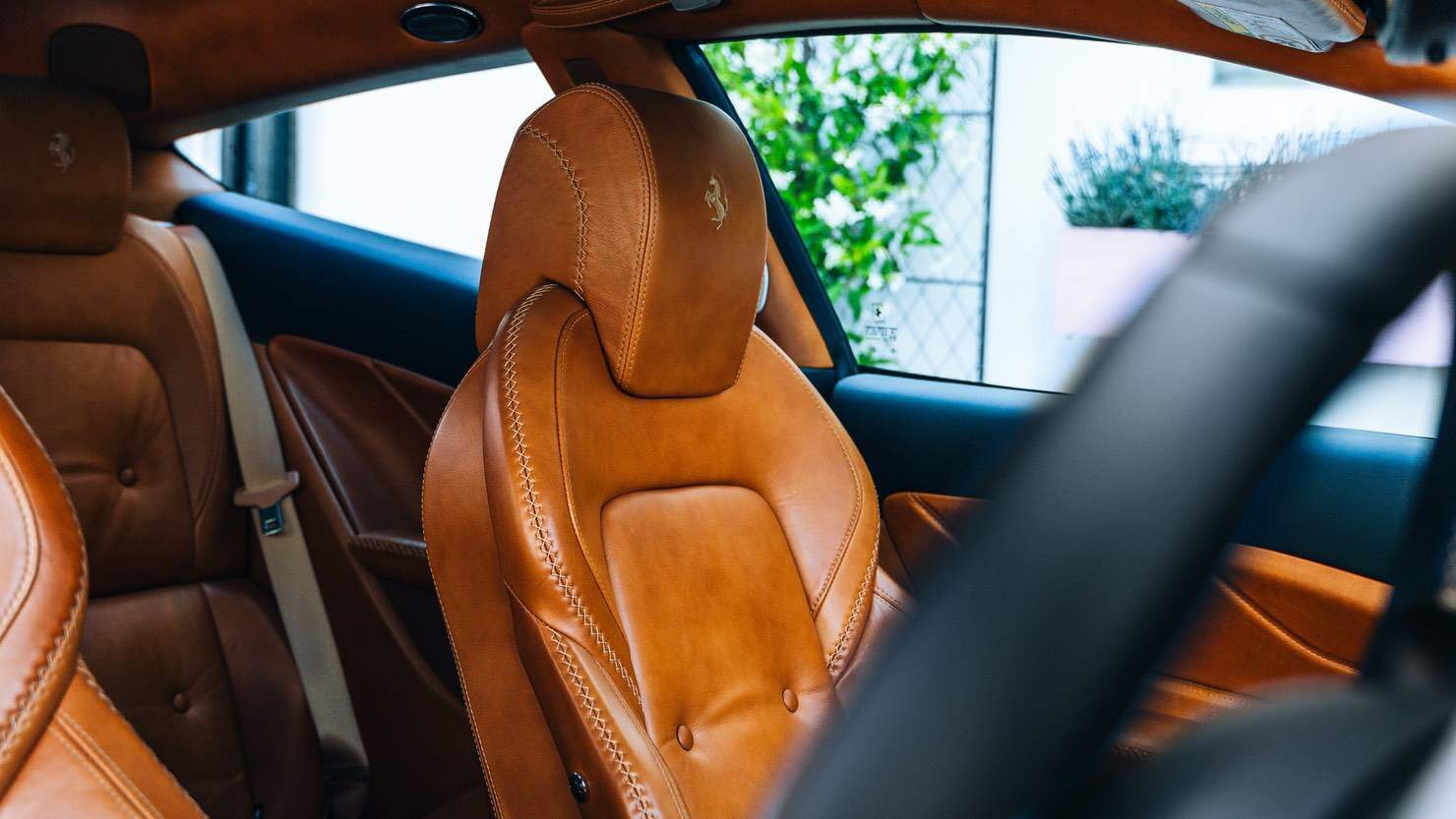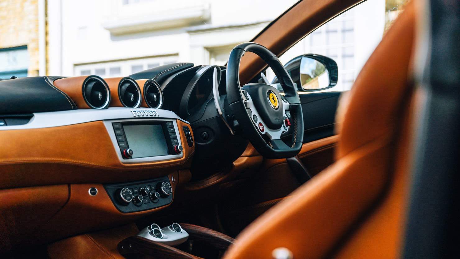 This particular car was built as a demonstration of Ferrari’s bespoke design programme and is highly specified throughout with options not available on the standard options list. This includes the 4-layer Piano Black paintwork with Grigio painted pinstriping, as well as seats inspired by the Dezza Poltrona Frau chair complimented by wood trim throughout the cabin and boot.